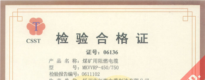 國家采煤機(jī)械質(zhì)量監(jiān)督檢驗(yàn)中心檢驗(yàn)合格證--煤礦用阻燃電纜(MKVVRP-450/750)