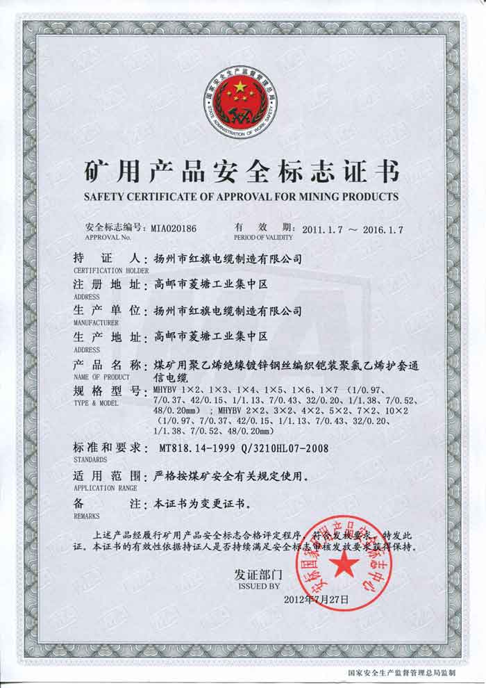 煤礦礦用產(chǎn)品安全標(biāo)志證書-MHYBV