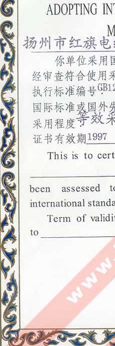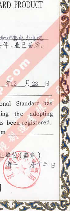國家技術(shù)監(jiān)督局采用國際標(biāo)準(zhǔn)證書(聚氯乙烯絕緣和護(hù)套電力電纜)